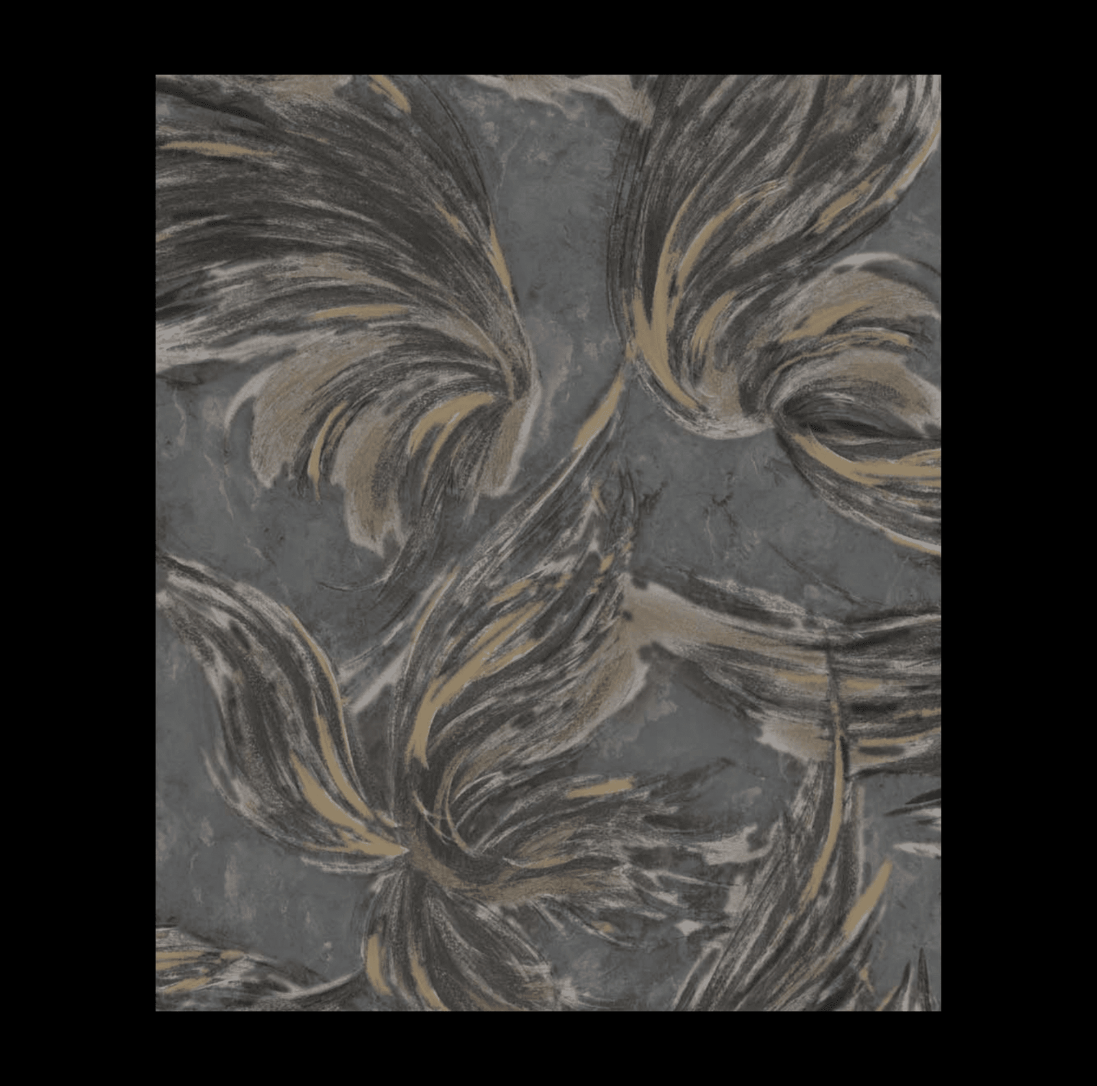 DRAMATIC ABSTRACT FEATHER WALLPAPER IN BLACK, GREY, AND GOLD FOR A BOLD AND ARTISTIC ACCENT WALLPAPER.